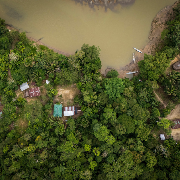 Portada: Vista de drone de casas en las orillas del río Bobonaza, en Sarayaku, Ecuador, julio de 2025. Foto: Karen Toro