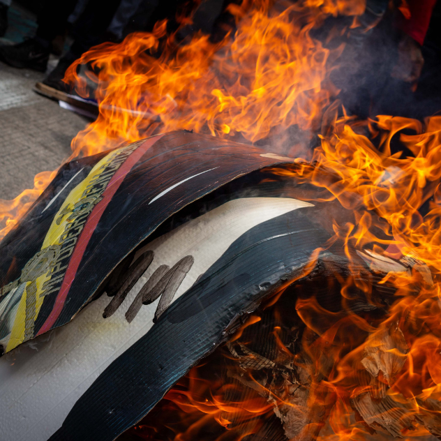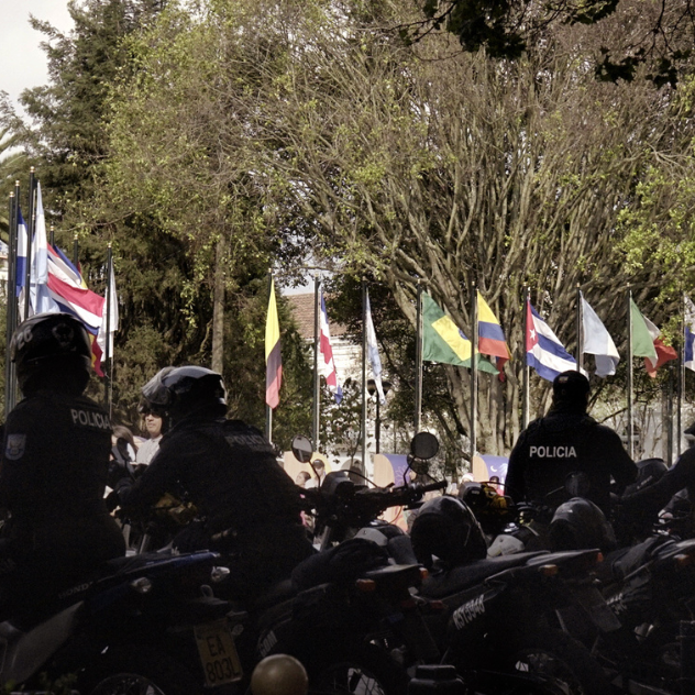 Portada: Flota policial frente al hemiciclo del Parque Calderón. Al fondo las banderas de los países integrantes de la Cumbre cuyos mandatarios estuvieron ausentes, a excepción de Portugal. Cuenca – Ecuador. 15 de noviembre de 2024. Foto: Liz Zhing…