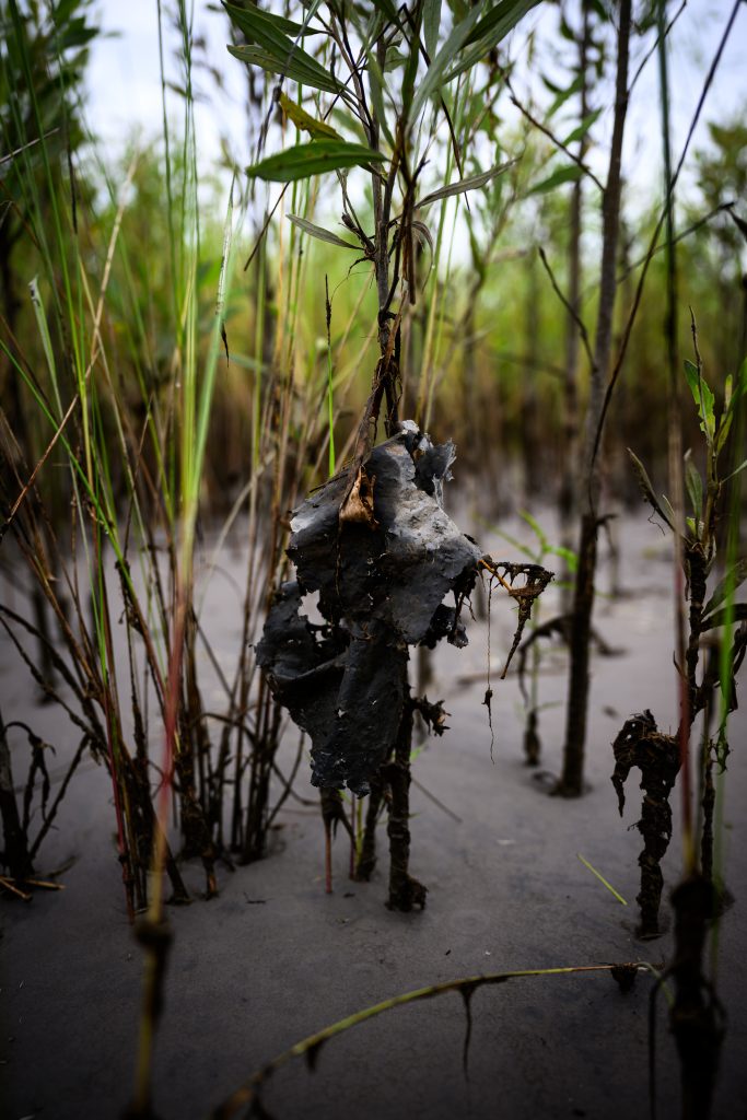 En una visita que realizamos con el equipo de La Periódica a una isla vecina de la comuna Amaru Mesa, afectada por un nuevo derrame que llegó desde el río Coca hasta el río Napo el 16 de junio de 2025, aún se ven los restos del derrame que dejaron manchas de crudo atrapadas entre las plantas que tratan de sobrevivir. Al tocar este material espeso y de un tono negro brillante, se desprende un aceite que huele igual a la gasolina. Pequeños retazos de una cinta amarilla de peligro alejan a las personas de esta zona contaminada, pero los rezagos de cada derrame se conservan en el fondo de la tierra.