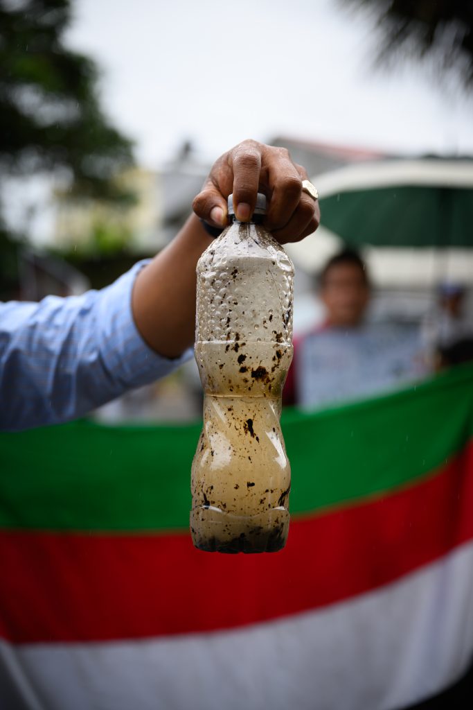 Frente a este panorama, “nosotros como dirigentes hemos prohibido coger el agua del río. Lo que buscamos es que ellos recolecten agua de lluvia para el consumo y que esa agua sea hervida”, afirma Shiguango. Cuenta que en 2020 el Gobierno del entonces presidente Lenín Moreno entregó un tacho para recoger el agua de lluvia, pero muchas veces no alcanza para las necesidades diarias y optan por lavar la ropa en el río. “Si usted ve, el agua tiene manchas, tiene óxido. Entonces, la ropita sale con el olor a óxido. Pero ya toca”. En verano, no cuentan con el agua de lluvia y deben racionar el consumo o comprar botellones.